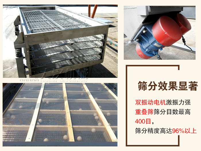 直線振動(dòng)篩采用雙振動(dòng)電機(jī)反向同步驅(qū)動(dòng),運(yùn)行可靠,激振力強(qiáng),有重疊篩選法、分層序列法以及聯(lián)合篩選法,篩分目數(shù)高400目,篩分精度高達(dá)96%以上,可篩選出7種粒度規(guī)格不同的物料。