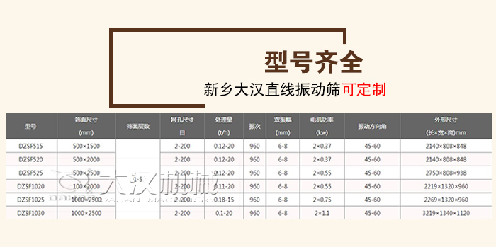 大漢廠家生產(chǎn)的直線振動(dòng)篩型號(hào)有DZSF515、DZSF520、DZSF525、DZSF1020、DZSF1025、DZSF1030等,不同星海對(duì)應(yīng)的篩分產(chǎn)量不同,可以更好地滿足用戶的篩分需要,新鄉(xiāng)大漢直線振動(dòng)篩可支持定制,您只需要告訴我您的要求,剩下的交給我們解決。