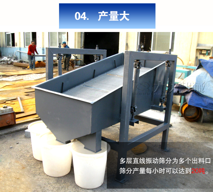 多層直線振動篩分為多個出料口,可把篩分物料按大小粒度分為多個等級,物料篩分規(guī)格多,篩分后的物料可以自動排出,采用雙臺電機驅(qū)動,振動力更強,物料篩分更徹底,篩分產(chǎn)量每小時可以達到20噸。