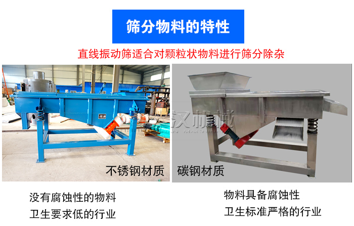 1)不同用戶選用的篩分物料不同,所以在選擇直線振動(dòng)篩時(shí)需要參考物料特性。如果您篩分的物料具備腐蝕性,此時(shí)不能選擇普通碳鋼材質(zhì)的直線振動(dòng)篩,需要采用不銹鋼直線振動(dòng)篩,而且針對(duì)有嚴(yán)格衛(wèi)生標(biāo)準(zhǔn)的行業(yè),如:食品,醫(yī)藥等行業(yè),也需要選擇不銹鋼材質(zhì)的直線振動(dòng)篩。