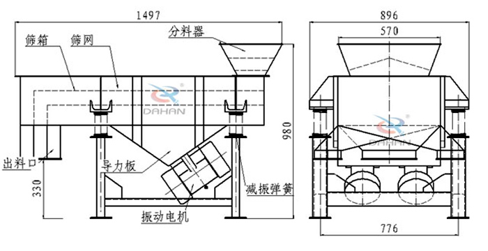 本篩機主要由篩箱、篩框、篩網、振動電機、電機臺座、減振彈簧、支架等組成。
